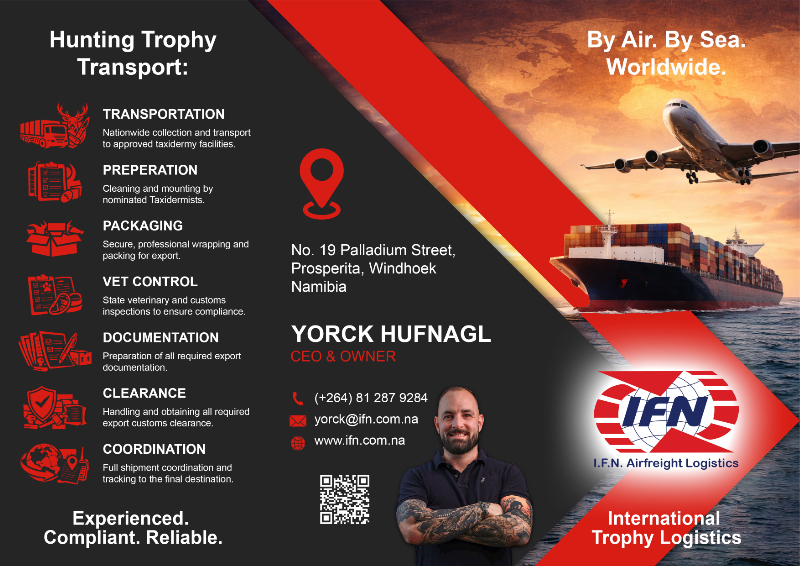 In regard to the shipment of your hunting trophies, we refer our clients to I.F.N. Airfreight Logistics to ensure that they are handled and shipped with care so that they reach their destination safely. Owner and manager of I.F.N. Airfreight Logistics, Yorck Hufnagl has many years of experience in the Namibian transport industry and consistently provides high customer service, expert advice and competitive pricing, since every shipment is unique, they constantly source the most beneficial rates for you.