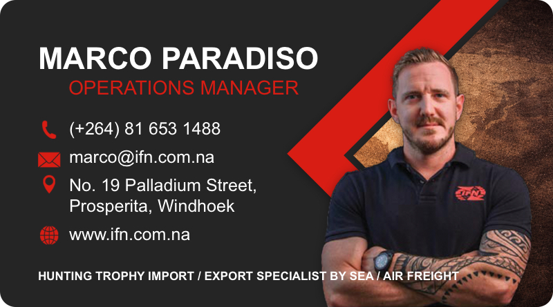 Should you want detailed information, or a quote for the shipping of your trophies to the country of destination you can find their contact information below. I.F.N. Airfreight Logistics is the shipping agent in Namibia that we have been working with for several years and that we refer to our clients.